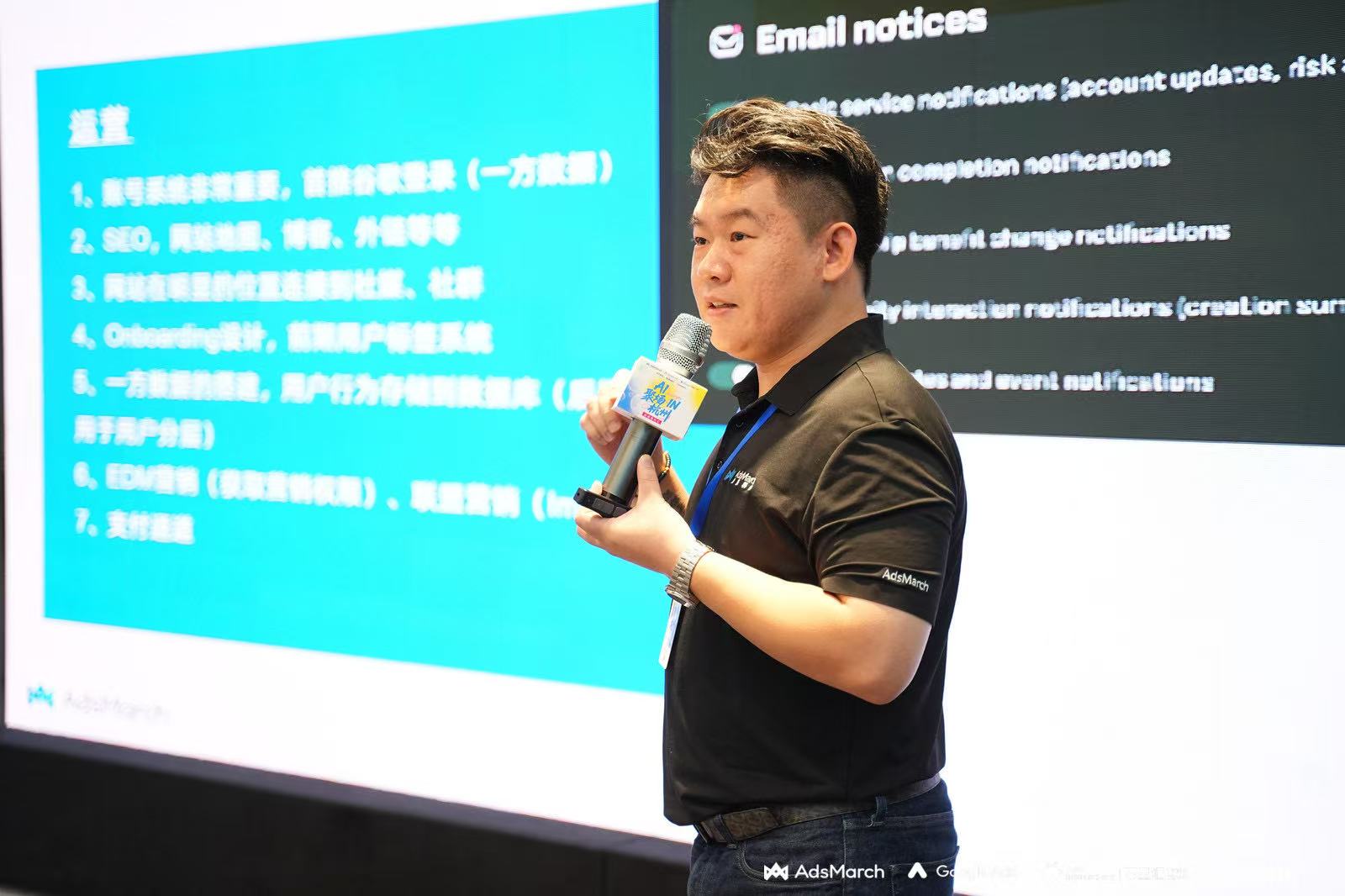 活动首个分享环节,AdsMarch麦炽科技创始人韩宗良先生带来《重塑AI出海逻辑,从拼产品到赢营销》主题分享。